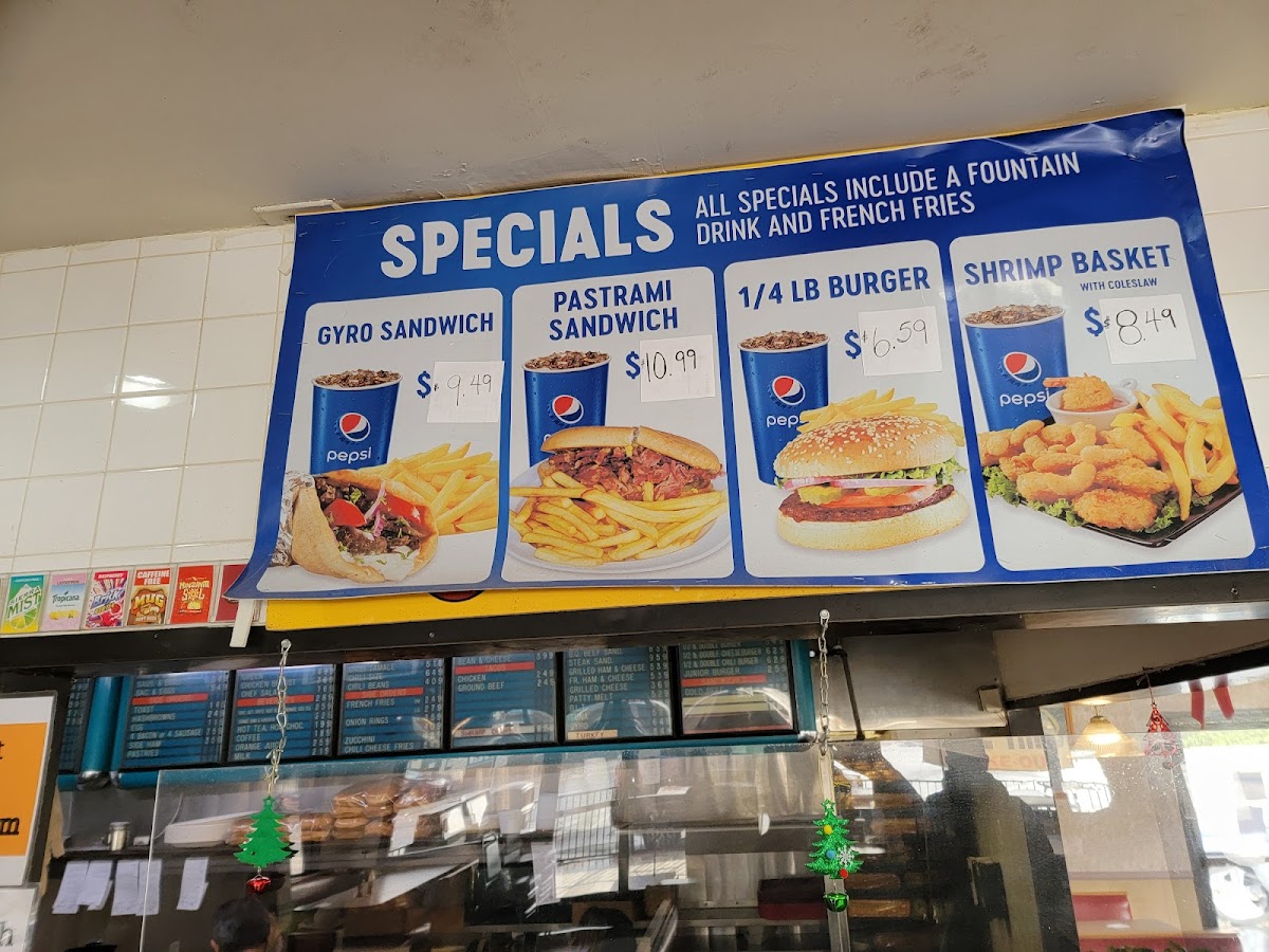 Burger and Sandwich Specials include various hamburger options ranging from quarter-pound singles to half-pound doubles, with choices such as the Junior Burger, 1/4 lb Hamburger Special, double cheeseburger, and an Angus burger. Sandwich choices also include a pastrami sandwich served on a French roll. These items typically come with standard accompaniments like lettuce, tomato, onions, and dressing.